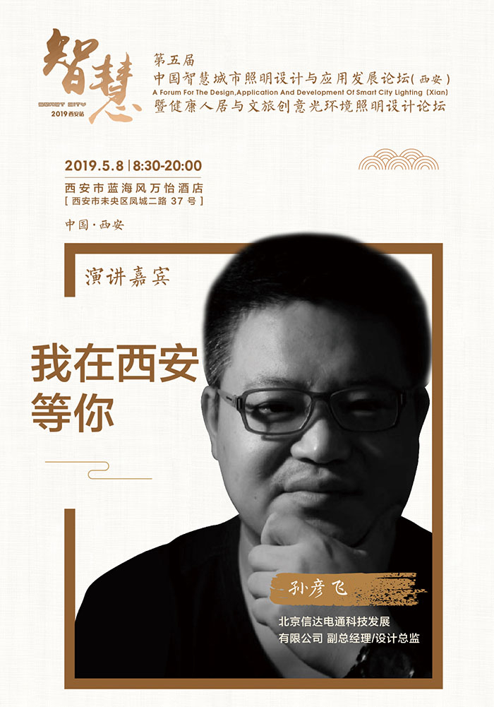 5月8日,由陜西省照明學會、《第一設計》全媒體平臺聯合主辦的第五屆中國智慧城市照明設計與應用發展論壇(西安)暨健康人居與文旅創意光環境照明設計論壇在西安藍海風萬怡酒店順利舉行。來自全國各地的行業大咖、專家學者、照明企業齊聚西安,共同探討,把脈行業未來。北京信達電通科技發展有限公司規劃設計總監孫彥飛先生出席論壇。