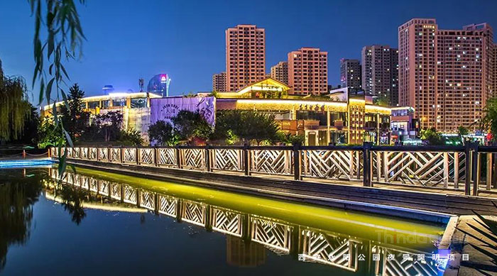 還有一些橋梁是屬于景區中的造景橋梁,例如棧道橋、玻璃橋或者是湖心橋,這類橋梁有木質或玻璃質地,再以燈光造景,來達到曲徑通幽之感,達到白天有景,夜間有色,景色合一的境界。通過以上的幾種橋梁亮化介紹,我們發現只有人參與進來的時候,橋梁的這種夜間美,才會被渲染到更大的程度,通過各種媒體渠道的傳播,橋梁的知名度也就有所提升,增加地區范圍內的網紅造勢。