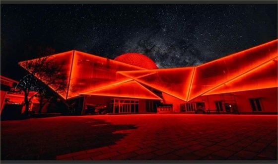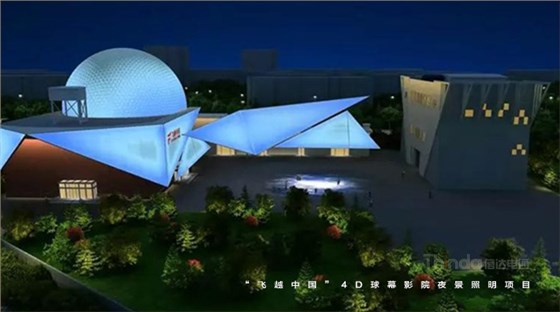 在光色的設(shè)計(jì)中,信達(dá)電通采用皓白、暖黃、科技藍(lán)等多種顏色漸變切換的設(shè)計(jì)手法。燈光重點(diǎn)勾繪外圍建筑輪廓,突出建筑的獨(dú)特結(jié)構(gòu),與球幕影院和廣場(chǎng)地面的投影形成互補(bǔ)和諧的夜景畫(huà)面。