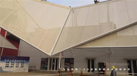 隨著球幕外立面光色切換,“我愛(ài)你中國(guó)”、“飛覽天下飛越中國(guó)”等主題字幕滾動(dòng)播出。為實(shí)現(xiàn)預(yù)期的設(shè)計(jì)效果,信達(dá)團(tuán)隊(duì)多次夜間試燈。