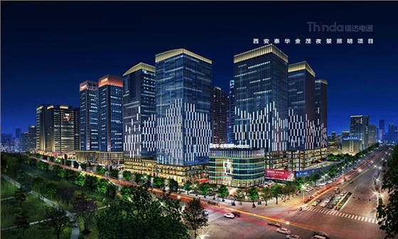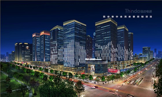 信達電通根據辦公樓的戶外亮化照明設計要素和泰華·金貿國際建筑景觀特點以及所處的地理位置,對泰華·金貿國際進行戶外亮化照明設計改造工作。在泰華·金貿國際的亮化設計中信達電通照明改變了泰華·金貿國際之前的色系昏暗,增加了建筑的外立面整體效果及廣告照明的效果,洗亮泰華·金貿國際建筑頂部,凸顯天際效果。使泰華·金貿國際成為西安夜色下一道亮麗的風景。