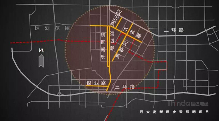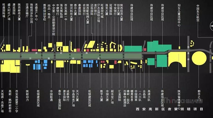 1991年3月西安高新區被國務院首批批準為國家級高新區,如今,西安高新區已成為一個代表西安與西部高新科技產業前沿的領地。2016年,西安高新區整體提升夜景照明,信達電通對高新區灃惠南路、唐延路和錦業路三條主干道及輻射的周邊建筑進行亮化升級改造,區域全長6.4KM。