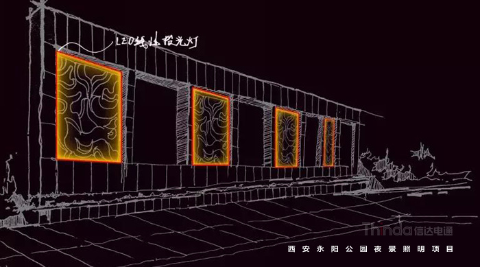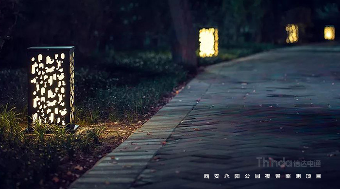 信達電通對永陽公園的設(shè)計范圍包括道路、山坡、水體、綠植、景觀小品、建筑等,以“一湖二山四廣場”為整體景觀內(nèi)容。亮度設(shè)計從全局出發(fā),不過于追求“亮”,保證路燈和步行道庭院燈、草坪燈的連續(xù),著力表現(xiàn)重點建筑、橋梁和節(jié)點,形成整體連續(xù),富有層次感的景觀序列。