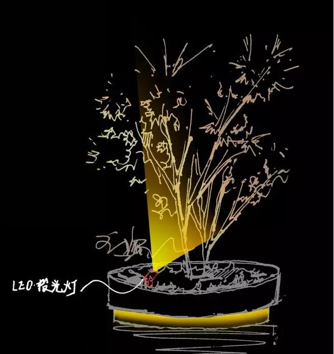 綠植景觀柱依據(jù)其構(gòu)造,進行分層照射,在燈具上采用小型投光燈將基座和頂部綠植部分分層打亮,頂部架投影燈營造氛圍照明;